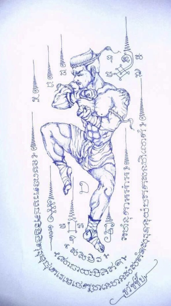 This tattoo honors Nai Khanom Tom, a legendary Muay Thai fighter known for his unparalleled skills and bravery. The design typically includes depictions of the fighter and symbolic scripts.